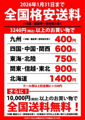 毎回大好評の全国格安送料キャンペーン開催です! 2026年1月31日まで、いつもよりさらにお得な送料でご利用いただけます! 全国送料無料!(代引手数料も無料!)(※北海道・沖縄県・離島な...